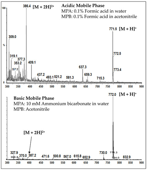 Figure 7). Hence, the optimized method employs a basic mobile phase system to achieve better sensitivity through charge state coalescence enabling lower detection limits.