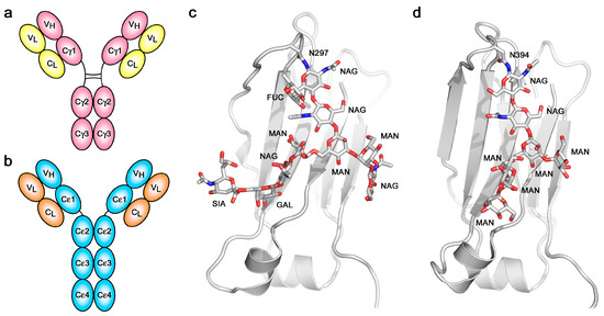 Overall structure and glycosylation. (a) Schematic representation of Immunoglobulin G (IgG). (b) Schematic representation of Immunoglobulin E (IgE). (c) The IgG Cγ2 domain contains complex carbohydrate covalently attached to Asn297 [26]. (d) The IgE Cε3 domain contains high-mannose carbohydrate covalently attached to Asn394 [27]. In panels (c,d), carbohydrate residues are labelled as follows: FUC, fucose; GAL, galactose; MAN, mannose; NAG, N-acetylglucosamine; SIA, sialic acid.