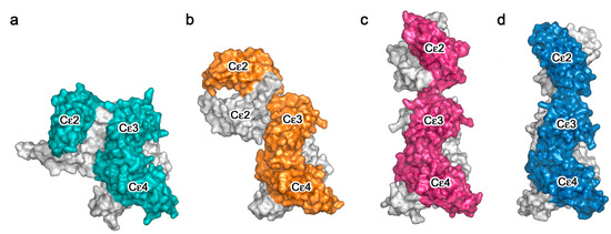 Despite the identical primary structures of the two heavy (and two light) chains, IgE, like IgG and all other antibody classes, is glycosylated [39,40,41,42], and since there is heterogeneity not only in the pattern of glycosylation at the various potential sites but also in the composition at any particular site, the two heavy chains within any one IgE (or IgG) molecule are not precisely identical. Whether or not this compositional asymmetry is related to the asymmetric bending of the IgE-Fc has not been explored. One glycosylation site is conserved across all antibody classes: Asn394 in the Cε3 domain of IgE, structurally homologous to Asn297 in the Cγ2 domain of IgG. Other potential sites in the Cε2 and Cε3 domains are not always fully glycosylated, but Asn394, like its homologues in other antibody classes, is always fully occupied [39,40,41]. The branched carbohydrate chains occupy space between the Cε3 domains, as they do between the Cγ2 domains of IgG, but there is a major difference between IgE and IgG in this respect: the glycosylation at Asn394 in IgE is of the “high-mannose” type, in contrast to the “complex-type” at Asn297 in IgG (Figure 1c,d). Other glycosylation sites in IgE that are exposed at the surface are complex-type, which suggests that the high-mannose composition at Asn394 may be due to the Cε2 domains impeding access of the mannosidase enzymes responsible for trimming the high-mannose structures prior to assembly of the complex-type glycoforms. The same high-mannose structure is seen in IgY-Fc between the Cυ3 domains [43], perhaps similarly due to the presence of Cυ2 domains. The high-mannose, branched carbohydrate chains in IgE-Fc not only make non-covalent (hydrogen bond, hydrophobic and van der Waals) contacts with the Cε3 domains to which they are covalently attached, and to the adjacent Cε4 domains, but also make contact with each other, bridging the two heavy chains [27,34,44]. Despite this apparent structural role, and again in contrast to IgG in which loss of glycosylation at Asn297 compromises FcγR binding [45], both FcεRI and CD23 receptor-binding activity is maintained in the absence of glycosylation; IgE-Fc expressed in bacteria and refolded [46,47], or deglycosylated following mammalian expression [48,49], binds to both receptors. However, glycosylation at Asn394 is essential for the expression of functional IgE in mammalian cells in vitro and in vivo [41,50].