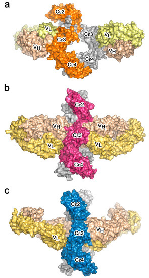 The picture that emerges from these structural studies is that of a highly flexible Fc region in which the Cε2 domains are capable of extending and twisting relative to the Fcε3-4 region, or bending over to either side, with the Cε3 domains adopting closed or open states. With regard to the flexibility of the whole IgE molecule, i.e., that of the Fab arms relative to the Fc, we lack crystallographic data, although molecular simulations suggest that the short Cε1-Cε2 linker of only five or six amino-acids substantially restricts the available conformations compared with the Fab arm flexibility mediated by the hinge regions in IgG subclasses [35,37]. This is consistent with earlier biophysical studies in solution, which showed less Fab arm flexibility in IgE compared with IgG [60]. Nevertheless, despite lacking an IgG-like hinge, the linker between the Cε2 and Cε3 domains can clearly permit bending of the whole IgE molecule, just as is seen in IgM with its (Cμ2)2 domains and no hinge [25], although in IgM the precise nature of the bending remains unresolved.