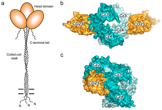 CD23. (a) Schematic representation of CD23: the three identical chains showing the triple α-helical coiled-coil “stalk”, C-type lectin-like IgE-binding “head” domains, and C-terminal “tails”. Figure adapted by permission from John Wiley & Sons, Inc. (Sutton, B.J.; Davies, A.M. Structure and dynamics of IgE-receptor interactions: FcεRI and CD23/FcεRII. Immunol. Rev. 2015, 268, 222–235 [6]). (b) The 2:1 complex between sCD23 (orange) and Fcε3-4 [51]. (c) The 1:1 complex between sCD23 (orange) and IgE-Fc, in which IgE-Fc adopts an acutely bent conformation [53]. In panels (b,c), IgE-Fc chains A and B are coloured dark cyan and pale cyan, respectively.