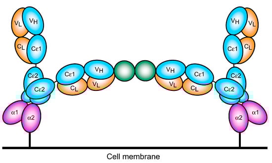 Activation of mast cells or basophils by cross-linking FcεRI-bound IgE may thus be envisaged as shown in Figure 8. The regions of space accessible to the two Fab arms appear to be more restricted and almost non-overlapping when IgE is bound to the receptor: one arm points “parallel” to the membrane while the other points away [35,37]. These topological constraints may need to be considered when IgE is used to target cell surface antigens, rather than soluble allergens, to allow simultaneous engagement with FcεRI on effector cells.