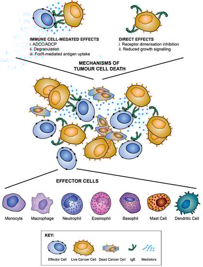 Human/mouse chimeric anti-HER2/neu IgE, and anti-EGFR (epidermal growth factor receptor) IgE, engineered from the original trastuzumab and cetuximab (IgG1) clones respectively, were shown to engender ADCC by human monocytic cells [163,164]. Specifically, anti-EGFR IgE triggered superior ADCC functions (70%) against cancer cells, compared with the corresponding IgG1 (30%) [164]. However, some episodes of anaphylaxis were observed in some patients with EGFR-positive tumours who received the anti-EGFR human/chimeric monoclonal IgG1 antibody cetuximab. These were caused by the presence of pre-existing IgE antibodies specific for the oligosaccharide galactose-α-1,3-galactose (α-Gal) on SP2/0-expressed cetuximab in a subset of individuals [165,166]. Furthermore, humans are known to carry IgG and IgM antibodies recognising α-Gal [167], and it is possible that these endogenous antibodies could have neutralised the anti-tumoural effects of cetuximab. Therefore, caution should be exercised in translating IgE class antibodies recognising EGFR on the grounds of safety and efficacy. An anti-human CD20 IgE triggered eosinophil-mediated ADCC and mast cell activation and killing of CD20-expressing tumour cells. Anti-HER2/neu, anti-EGFR, anti-CD20, anti-folate receptor alpha (FRα) IgE and anti-prostate specific antigen (PSA) IgE antibodies were all able to trigger rat basophil leukaemia (RBL) SX-38 mast cell degranulation when cross-linked in different ways including soluble antigen/polyclonal antibody complexes, cancer cells expressing multiple copies of the target antigen, and polyclonal anti-IgE. Furthermore, anti-HER2/neu (trastuzumab) IgE demonstrated the ability to exert direct effects on tumour cell viability in the absence of effector cells, equivalent to those reported to be triggered by trastuzumab IgG [163]. This supports the notion that anti-tumour IgE antibodies may be capable of engendering direct effects attributed to IgG equivalent agents, whilst perhaps still able to harness class-specific effector functions (Figure 9).