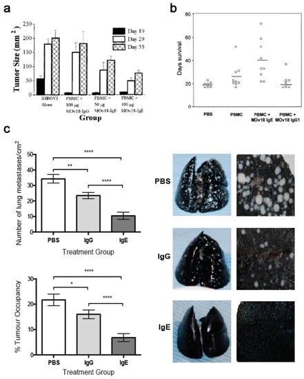 In an s.c. human ovarian cancer (IGROV1) xenograft grown in a SCID mouse model, animals administered with mouse/human chimeric MOv18 IgE or MOv18 IgG1, intravenously (i.v.) exhibited an initial inhibition of tumour growth up to day 19 post-tumour challenge. However, the tumours in mice administered PBMCs and MOv18 IgG1 subsequently grew to the same size as the controls. In contrast, mice administered PBMCs and MOv18 IgE exhibited reduced growth of up to 72% by day 35 post-challenge. In a range of experiments in this model, a single treatment with MOv18 IgE and PBMC significantly restricted the growth of ovarian tumours (Figure 11a) [147]. In specimens sampled at the end of these studies, tumours from the mice that received PMBCs and MOv18 IgE showed significantly larger areas of necrosis compared with those from mice treated with non-specific control IgE plus PBMCs, or those given PBMCs alone. Furthermore, when administered to IGROV1 xenograft mice in the absence of human PBMC, MOv18 IgE did not significantly inhibit tumour growth. Therefore, in the IGROV1 xenograft model, the anti-tumour efficacy of MOv18 IgE was found to be reliant on the presence of both an effector cell population and an IgE targeted to a tumour-expressed antigen.