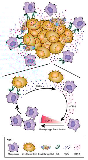 - Josephs, D.H.; Bax, H.J.; Dodev, T.; Georgouli, M.; Nakamura, M.; Pellizzari, G.; Saul, L.; Karagiannis, P.; Cheung, A.; Herraiz, C.; et al. Anti-Folate Receptor-α IgE but not IgG Recruits Macrophages to Attack Tumors via TNFα/MCP-1 Signaling. Cancer Res. 2017, 77, 1127–1141. [Google Scholar] [CrossRef]