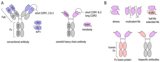 Structure of Nanobodies. (A) Structure of conventional antibodies (cAb), single-chain variable fragments (scFv), heavy-chain antibody (HcAb), and Nanobodies (Nbs). (B) Nbs can be produced as dimers and multimers to improve binding to their target or linked to an anti-albumin Nb to increase their in vivo half-life. Latter can be also achieved by fusing an Fc region of e.g., human IgG. Further, bispecific Nb-Fc-fusion proteins can also be expressed.