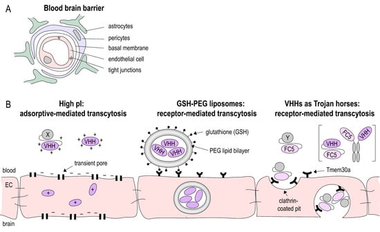A major challenge for brain-targeting biologics is crossing of the BBB (Figure 2A). Under physiological conditions, only a very small fraction of intravenously injected cAbs cross the BBB (IgG CNS/plasma ratio: 0.1–1%), and once reaching the brain parenchyma, they are rapidly cleared by FcRn mediated efflux [,]. Nbs, on the other hand, lack an Fc region, are smaller in size, and more stable, promising facilitated delivery to the brain. However, when administered under non-pathological conditions, monovalent Nbs do not reach sufficient concentrations for in vivo brain imaging [] and therapeutic purposes []. Pierre Lafaye’s group was able to show that the brain penetration of Nbs can be improved by exploiting the process of adsorptive mediated transcytosis [,]. This transcytosis mechanism has been earlier identified to shuttle basic proteins and peptides across the BBB []. The basicity of a Nb can be increased by exchanging the carboxyl groups of the Nb with positively charged amino groups, thereby increasing the isoelectric point. The same group developed Nb-fluorochrome constructs (with pI = 8.3 and 9.5) that successfully label targets in an Alzheimer’s disease model after being administered intravenously []. Nevertheless, high Nb concentrations (10–50 mg/kg) are required for detection and Nbs were only detectable for 4 h post-injection, suggesting a half-life too short for therapeutic purposes. The latter issue can be addressed by extending the half-life of Nbs. However, there is some controversy about the benefit of half-life extended Nbs for brain targeting. Iqbal et al. showed that fusion of an anti-EGFR Nb to a human Fc fragment improved the imaging of brain tumors [], while another study of the kinetics of Nb-Fc fusion proteins showed that despite the extended serum half-life, the modification did not improve delivery across the BBB [].