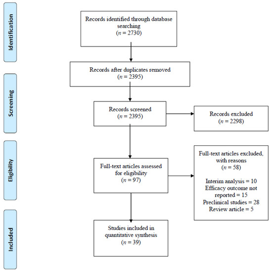 We identified 2730 studies using PubMed (90), Cochrane (150), EMBASE (725), SCOPUS (1749) and ClinicalTrials.gov (16). After excluding 335 duplicates, we read titles and abstracts of the remaining 2395 articles and excluded an additional 2298 articles that were review articles, expert opinions, preclinical studies, monoclonal antibodies targeting cancers other than MM and studies on daratumumab and Elotuzumab. We read full-length manuscripts of the remaining 97 articles and excluded 58 articles based on the following reasons: no efficacy outcomes reported (15), interim analysis (10), preclinical studies (28), review articles (5). Thirty-Nine (39) clinical trials that met our inclusion criteria included 1906 patients. (Figure 1: PRISMA flow diagram).