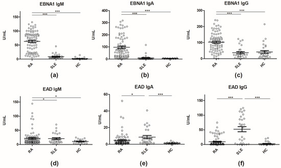 Reactivity of rheumatoid arthritis (RA) (n = 77), systemic lupus erythematosus (SLE) (n = 27 and healthy control (HC) sera (n = 29) to early antigen diffuse (EAD) and Epstein-Barr Virus nuclear antigen (EBNA) 1 (IgM, IgA and IgG reactivity) analyzed by enzyme-linked immunosorbent assay. (a) IgM antibody reactivity to EBNA 1; (b) IgA antibody reactivity to EBNA1; (c) IgG antibody reactivity to EBNA1; (d) IgM antibody reactivity to EAD; (e) IgA antibody reactivity to EAD; (f) IgG antibody reactivity to EAD. * = p < 0.05, *** = p < 0.0001. EBNA1, Epstein-Barr virus nuclear antigen 1; EAD, early antigen diffuse; HC, healthy control; RA, rheumatoid arthritis; SLE, systemic lupus erythematosus.