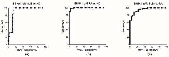 For EBNA1 IgM and IgA, the differences were highly statistically significant between RA and SLE and RA and HCs (p < 0.0001) (Figure 1a,b). Moreover, ROC curves (Figure 2) revealed high sensitivities and specificities with AUC values > 0.9 (Table 1). Best discrimination between RA and HC was achieved by EBNA1 IgM (AUC = 0.995), which also discriminated RA from SLE (AUC = 0.953) and SLE from HC (AUC = 0.916). The corresponding values for EBNA1 IgA were slightly lower but still very high (Table 1). In contrast EBNA1 IgG had much lower discriminating power (Figure 1, Figure S1) with AUC values ranging from 0.5198–0.8356, which also is reflected in the antibody reactivity pattern (Figure 1c).