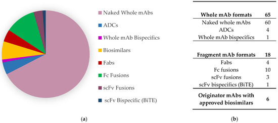 Since the first therapeutic monoclonal antibody (mAb) Orthoclone OKT3® (Janssen Biotech, Horsham, PA, USA) was approved by the USA Food and Drug Administration in 1986, whole antibody therapeutics have become and persistently remain the most dominant and significant biologic therapeutic platform in the pharmaceutical industry [1,2]. To date, therapeutic antibodies treat a plethora of indications including cancers, infections, autoimmune disorders, and cardiovascular and neurological diseases [3]. The whole antibody therapeutics platform is regarded as the most promising class of pharmaceutical technology to date; it is continually being applied to newly identified biological targets and implemented in many formats to produce strategically engineered next generation antibody therapeutics, otherwise termed “biobetters” [4,5,6,7,8,9]. The international ImMunoGeneTics information system® (IMGT®, Montpellier, France) database reveals that as of December 2018, 65 whole antibodies and 18 next generation fragment or recombinant fusion antibody-based therapies are approved for clinical use, with hundreds more in clinical trials expected to reach market.