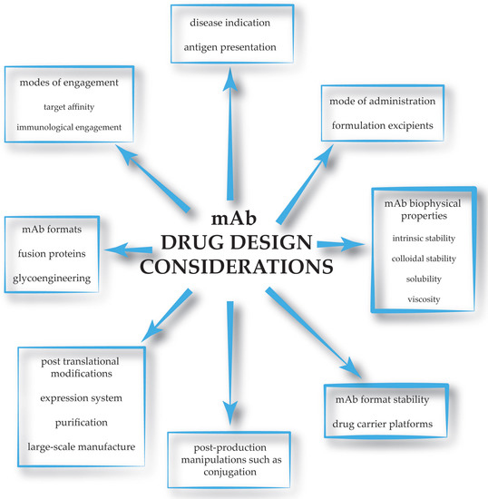 Schematic representation of the concept stages of mAb drug development in which considerations follow on from one process to the next in the design and manufacture of mAb-based therapeutics.