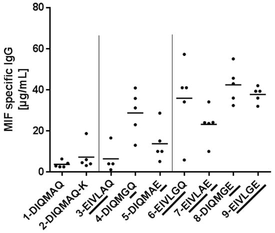 MIF specific IgG titer was measured by enzyme-linked immunosorbent assay (ELISA). Typically, 96-well plates were coated with full length recombinant human MIF and incubated over night at +4 °C. Plates were then blocked by 1.5% fish gelatin diluted in phosphate-buffered saline (PBS), washed with PBS four times before applying samples in different dilutions. Samples were incubated 2 h at room temperature, the plates were washed four times with PBS, and human IgG was detected with a horseradish peroxidase-conjugated goat anti-human IgG (Sigma Aldrich, Taufkirchen, Germany). Finally, plates were washed four times with PBS before TMB (3,3′,5,5′-tetramethylbenzidine) was added. After incubation in the dark at room temperature for 30 min the reaction was stopped by addition of 1.8 M H2SO4. The amount of chromogenic product formed was determined spectrophotometrically at 450 nm.