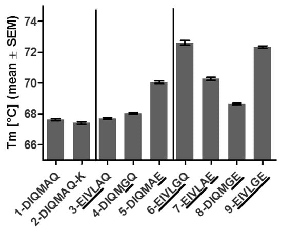Combinations of Q79E with DIQM1-4EIVL or A66G (7-EIVLAE or 8-DIQMGE) did not increase Tm further compared to single mutation Q79E alone (5-DIQMAE). In contrast, combining DIQM1-4EIVL and A66G (6-EIVLGQ) or DIQM1-4EIVL, A66G and Q79E (9-EIVLGE) had a synergistic effect, i.e., increased Tm compared to the variants with mutations in a single region (3-EIVLAQ, 4-DIQMGQ, 5-DIQMAE). Hence, 6-EIVLGQ and 9-EIVLGE had the highest Tm of all BaxM159 variants with an increase of >4 °C compared to the parental BaxM159. All findings, which were obtained by differential scanning fluorimetry, were confirmed by differential scanning calorimetry (Supplementary Figures S3 and S4).