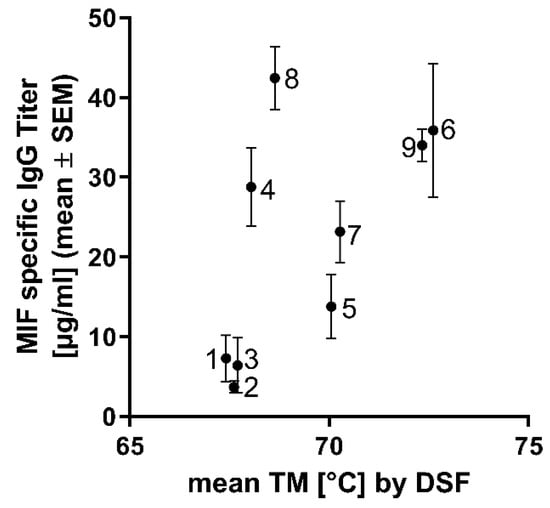 Correlation between thermal stability (Tm) of BaxM159 variants and MIF specific IgG titer. Thermal stability was determined by differential scanning fluorimetry (DSF). Standard error mean (SEM) of MIF specific titer is indicated by whiskers. Numbers indicate the ID of the antibody variants as described in Table 1.
