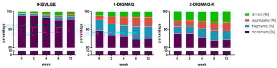 Aggregation/fragmentation of BaxM159 variants determined by size-exclusion chromatography (SEC) over a time course of 12 weeks at 4 °C.
