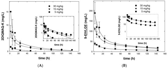 Pharmacokinetics of parental BaxM159 2-DIQMAQ-K (A) and BaxM159 variant 9-EIVLGE (B) after intravenous administration to MF1 nude mice. BaxM159 variants were injected intravenously via the tail vein into male MF1 nude mice (n = 4) at doses of 5, 10, 30 mg/kg. Blood (80 µL) was drawn at the indicated time points and centrifuged to generate plasma. The concentration of human IgG was determined by ELISA in these plasma samples. The solid lines in panel (A,B) were drawn by fitting the data points to the equation for a biexponential decay/two-compartment model with the notable exception of the curve for 5 mg/kg parental BaxM159 2-DIQMAQ-K (squares in (A)). It is evident that the concentrations of the 5 mg/kg parental BaxM159 2-DIQMAQ-K were below the detection limit at time points > 48 h. Hence, there were not enough data points and the data were only fitted to the equation for a monoexponential decay. The insets show the logarithmic transformation of the data to illustrate the presence of two components.