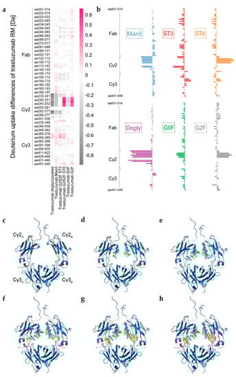 Average deuterium (D) uptake differences (Da) of trastuzumab reference material (RM) and glyco-engineered trastuzumab variants (n = 6) after 10 min of H/DX. (a) Differential heat map and (b) uptake plot of (shared) trastuzumab heavy chain peptides, resulting from pepsin/type XIII digestion (sequence coverage 87%–94%). (c–h) Differential D, uptake as established in (a) and projected onto Fc crystal structures based on PDB ID code 5VGP: (c) “Degly”, (d) “Man5”, (e) “G0F”, (f) “G2F”, (g) “ST3”, and (h) “ST6”.