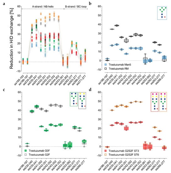 Reduction in H/DX (%) of trastuzumab glycan variant Cγ2 domain peptides, resulting from pepsin or pepsin/type XIII digestion (sequence coverage 87%–94%), normalized with the de-glycosylated trastuzumab sample. (a) Single peptide values of three targeted (10 min H/DX) experiments with trastuzumab Man5 (light blue), G0F (green), RM (black), ST3 (red), G2F (gray), and ST6 (orange). (b–d) Box plots with single peptide values of single experiments (n = 6) and representing boxes showing minimum, 25th percentile, median, 75th percentile, and maximum values. Additional statistical significance testing was as recently described by Hagemann et al.; see Figure S3 [60].