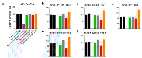 (a–f) Relative FcγR binding (%) of trastuzumab (glyco-)variants, as normalized with 1 trastuzumab starting material. Binding affinities were measured by surface plasmon resonance (SPR) technology; n = 3.