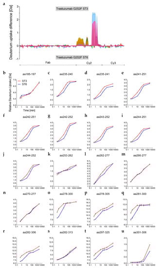 We further analyzed the observed differences in H/DX and corresponding binding affinities for Fcγ receptors between the ST3 and ST6 variants by an expanded H/DX approach (time course experiment). The differences in H/DX between the α-2,3 and the α-2,6-sialylated trastuzumab variants observed at 10 min deuterium incubation time (Figure 3d) could be verified for the additional time points investigated (0.5 min, 1 min, 10 min, 30 min, 1 h, 3 h, and 48 h), as shown in Figure 5. Sequence coverages of 88% for both the heavy and the light chains were achieved. As illustrated in Figure 5, the two G2S2F variants revealed significant uptake differences for the heavy chain Cγ2 domain regions L235–M252, V262–W277, and Y278-N325 (no changes were seen for the light chain as shown in Figure S2). The respective values and peptic/type XIII peptides are listed in the Supplementary Table S3. The three regions of varying D uptake also revealed differences in the exchange rates (Figure 5a). The corresponding relative D uptake curves are depicted in Figure 5b–u. For the residues L235–M252, the maximum D uptake difference between the two sialic acid variants was already reached after 10 min (Figure 5c–j). With an uptake difference of Δ0.3 Da for the aa235–241 and Δ0.6 Da for the aa242–252 peptides, the ST3 variant exchanged more hydrogen than the α-2,6-linked ST6 variant in this region (Figure 5d,g and Table S3). Notably, only the peptide aa235–241 exhibited further H/D exchange beyond 60 min in this region (Figure 5d). The area V262–W277 (e.g., aa263–275) followed an overall faster exchange rate, but the uptake difference maximum appeared later (after 60 min with maximum Δ0.7 Da uptake difference; see Figure 5l and Table S3). This explains the overall lower H/DX differences observed in the preceding 10 min targeted approach for that sequence area (V262–W277), as shown in Figure 3a. The uptake difference maximum for the glycosylated region Y278–N325 (C-strand to FG-loop) was reached even more rapidly (Figure 5a). Comparison of the doubly sialylated glyco-peptide revealed more D uptake within the C’E-loop (E294-R301) for several ST3 variant peptides within the region (Figure 5o–t). In detail, maximum uptake differences compared to the ST6 variant were observed already after 1 min; e.g., with Δ2.6 Da for the peptide aa278–305 (Figure 5p). We further found that amino acid regions adjacent to the glycosylation site showed slow H/D exchange rates at incubation times <60 min. As visible for the heavy chain peptide aa301–306 (Figure 5u), a significant exchange difference can only be detected after 3 h (Δ0.2 Da) and 48 h (Δ0.5 Da). Together, this indicates that the α-2,3-linkage impacts the glycan dynamics more significantly, resulting in an increased motion of the Cγ2 C’E-loop area compared to the α-2,6-linkage.