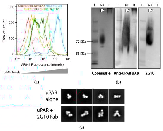 Purified uPAR (5 μg) under reducing (33 mM TCEP (tris(2-carboxyethyl)phosphine) reducing agent) and non-reducing conditions were subjected to electrophoresis on both native and SDS-PAGE and transferred to PVDF membranes. Nonspecific binding was inhibited by incubation in TBST [20 mM Tris-buffered saline (pH 7.5) with 0.1% Tween 20] containing 5% non-fat dry milk for 1 h at room temperature (RT). Gels were stained with InstantBlue™ Coomassie Protein Stain (Expedeon Inc., San Diego, CA, USA) while membranes were primarily incubated with either goat polyclonal anti-uPAR antibodies (AF807 10 µg/mL, R&D systems) or 2G10 (10 µg/mL) expressed on a human IgG scaffold in 5% non-fat dry milk for 1 h, washed three times with TBST for 15 min and incubated at RT for 60 min with horseradish peroxidase (HRP)-conjugated secondary antibodies diluted 1:1000. Afterwards, membranes were washed again three times for 15 min with TBST. The chemiluminescence emitted from Immobilon Forte Western HRP Substrate (Millipore Sigma, Burlington, MA, USA) after treatment with antibody-conjugated HRP and proteins thus labeled were visualized using the ChemiDoc XRS+ Imaging system (BioRad Laboratories, Inc., Hercules, CA, USA).