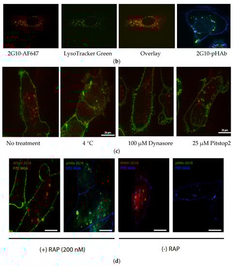 Immunofluorescence microscopy was used to localize the 2G10 within MDA-MB-231 cells. We had previously shown that 2G10 does not internalize to MCF7 cells [19]. Lysosomes, visualized using LysoTracker (green signal) were distinct and punctate. MDA-MB-231 incubated with LysoTracker and 2G10-AF647 (red signal), 10 µg/mL, 1 h at 37 °C), and resulted in a yellow signal indicating colocalization of the 2G10-AF647 and the lysosomes. This image showed that most of the ADCs end up in the lysosome (Figure 3b). Conjugation of 2G10 to a fluorophore with very low fluorescence at pH > 7 (pHAb) also shows migration of 2G10 to the lysosome (Figure 3b). Inhibitors of clathrin-mediated endocytosis reduced the internalization of 2G10. Endocytosis inhibitors tested were: low temperature (performing the entire experiment at 4 °C); clathrin inhibitor PitStop® 2 (25 μM); or dynamin inhibitor Dynasore (100 μM) for 30 min prior to a one-hour incubation with 2G10-AF647 (Figure 3c). Low temperature inhibits multiple internalization mechanisms and was able to prevent the internalization of 2G10-AF647, whereas the endocytosis blockers, Dynasore and Pitstop 2 reduced but did not stop internalization. The uPAR-specific endocytosis inhibitor RAP (200 nM) did not affect antibody internalization to MDA-MB-231 (Figure 3d).