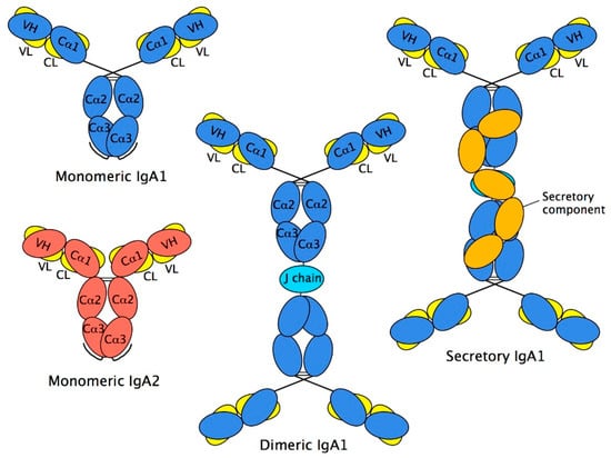Schematic diagram of IgA structures—monomeric, dimeric, and secretory IgA. In IgA1, the heavy chain domains are in blue, and those of the light chains in yellow. In IgA2, the heavy chain domains are in red, and the light chain domains in yellow. The tailpieces are shown as extensions to the C-termini of the Cα3 domains in the monomeric forms. Dimeric and secretory forms of IgA2 are not depicted. J chain, which is present in both dimeric and secretory IgA, is shown in cyan. The domains of secretory component, derived from the extracellular region of pIgR, are present in secretory IgA and are shown in orange.