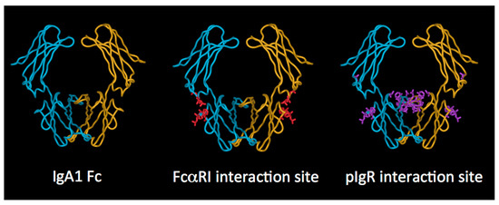 Turning to the elements of dimeric IgA involved in the interaction, it is believed that the initial interaction involves engagement of D1 of pIgR with an exposed loop (residues 402–410) and other close lying residues (Phe411, Val413, Thr414, Lys377) on the Cα3 domain of IgA, along with a region on the Cα2 domain (Pro440–Phe443) lying at the Cα2–Cα3 domain interface (Figure 4) [41,42,43]. Thereafter, a disulphide bound formed between one of two cysteine residues in D5 of pIgR (Cys468 or Cys502) and Cys311 in the Cα2 domain of IgA anchors SC and dimeric IgA together [44]. It has also been demonstrated that direct interactions between J chain and pIgR occur [45].