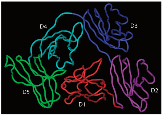 Crystal structure of the extracellular domains of human pIgR (using coordinates from PBD accession code 5D4K). Each of the five domains (D1–D5) has been coloured differently.