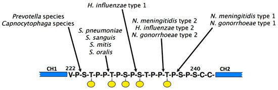 Each IgA1 protease cleaves a specific site within the IgA1 hinge, either a Pro–Thr or a Pro–Ser peptide bond (Figure 8). In order for IgA1 proteases to recognise the IgA1 hinge as a substrate, it has become clear that not only sequence elements within the hinge itself are important [112,113], but, at least for some IgA1 proteases, also specific regions of the IgA1 protein lying well beyond the hinge. Thus, for efficient cleavage to occur, the susceptible bond is required to be positioned at a suitable position relative to the Fc [114], and some proteases also require the presence of elements within the Fc region of IgA1 [115,116]. Specifically, Cα3 domain residues Pro440–Phe443, which as mentioned above form part of the interaction sites for FcαRI and pIgR, have been shown to be a requirement for cleavage of IgA1 by the N. meningitidis type 2 IgA1 protease, while for the H. influenzae type 2 enzyme, different Cα3 residues predicted to be involved in pIgR interaction are required for cleavage to proceed [116]. Echoing the case with IgA binding proteins, these requirements suggest that IgA1 proteases may have commandeered conserved host receptor sites for their own benefit. One can envisage an interaction between IgA1 protease and the IgA1 molecule as a whole, with the protease engaging with elements within the Fc region as a means to stabilise a particular IgA conformation and aid positioning of its active site next to the IgA1 hinge. Indeed, the solved X-ray crystal structure of an H. influenzae IgA1 protease is consistent with such a possibility [117].