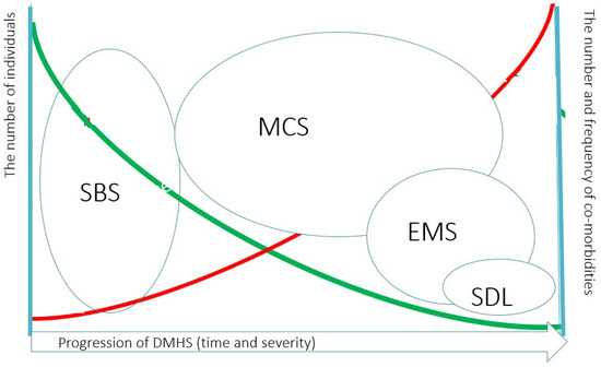 The clinician point of view of the pyramid of the progression of Dampness and Mold Hypersensitivity Syndrome and how it is related to Sick Building Syndrome. Dampness and Mold Hypersensitivity Syndrome (DMHS) progresses with prolonged or cumulative exposure to indoor air dampness microbiota. Simultaneous exposure to other xenobiotics may foster the development of symptoms. At some time point SBS becomes irreversible and at this stage the patient may develop Multiple Chemical Sensitivity (MCS). Some fraction of patients will develop in addition to MCS the Electromagnetic Sensitivity (EMS) and a very small fraction of patients have sensitivity to daily light (SDL). Noteworthy, MCS and EMS may overlap. The green line indicates the relative prevalence of severe hypersensitivity manifestations in DMHS. The red line indicates the relative frequency and the numbers of concomitant co-morbidities with the development of severe hypersensitivity.