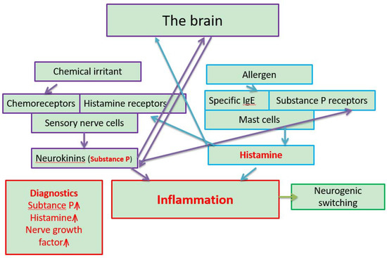 The interplay between allergic (boxes with blue lines) (IgE-mediated) and non-allergic neurogenic inflammation (boxes with violet lines) in Multiple Chemical Sensitivity (MCS) related to the Dampness and Mold Hypersensitivity Syndrome (DMHS). Customized from” The role of neurogenic inflammation in chemical sensitivity”, Meggs, W.J. Ecopsychology 2017, 9, 83–89. MCS is the 4th criterion of the DMHS (Valtonen, Front Immunol 2017). When a person is exposed to xenobiotics that are generally small molecules (hundreds of Da), those bind to chemoreceptors that may be hyper-activated due to previous prolonged or cumulative exposures to environmental toxins. This binding results in the release of potent messengers of neurogenic inflammation, the so-called neurokinins, e.g., Substance P (SP). SP may pass through the blood brain barrier and induce neuroinflammation in the brain. Also, SP binds to SP receptors on mast cells that upon activation release histamine. When a person encounters protein from dampness microbiota (thousands of Da) to which (s) he might have been already sensitized (the presence of IgE-antibodies) mast cells become activated through the binding of IgE-antibody complexes to e.g FcεR1 receptors. The release of histamine causes systemic inflammation and augments the hyper-activation of sensory receptors. Histamine and inflammation are central to the pathology of MCS (highlighted in red). Histamine may pass directly to the brain. Neurogenic switching can occur as the inflammation may proceed to organs (e.g., skin or g-i tract) other than the cite of inoculation (e.g., airways) (Meggs, 2017). The proposal for biomarkers is presented in a separate box with red lines.