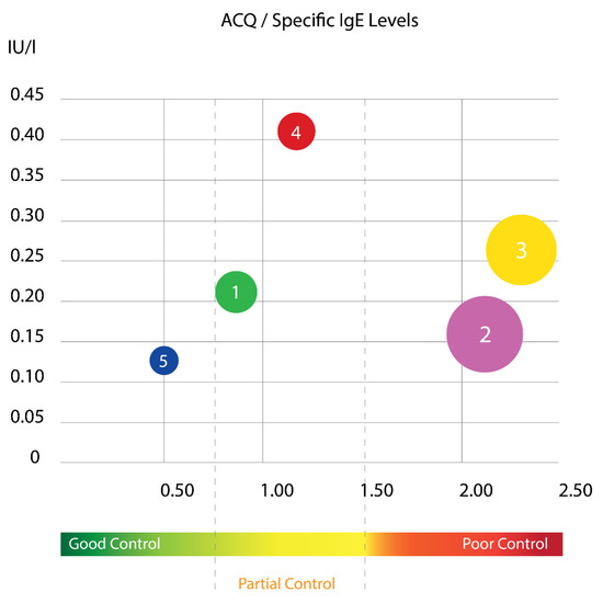 Figure 4). The distribution of the specific IgE levels according to ACQ score in different cluster groups is presented at