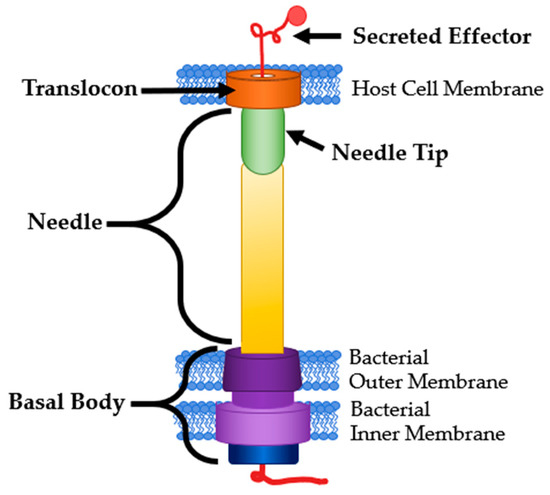 The type III secretion system (T3SS) is a multimeric protein complex used by many pathogenic Gram-negative bacteria to cause and maintain an infection [1]. Pathogens that use a T3SS include Chlamydia trachomatis, Escherichia coli, Pseudomonas aeruginosa, Salmonella enterica, Shigella spp., Vibrio cholerae, and Yersinia pestis [2]. The T3SS functions as a molecular syringe, sometimes called an injectisome that bacteria use to translocate effector proteins directly into a host cell (Figure 1) [3]. The T3SS is comprised of three major components. First, a basal body that anchors the structure to the bacterial membrane containing an ATPase at the base that powers the secretion of proteins. Next, the needle itself acts as a tunnel that spans the extracellular space between the pathogen and host cell. Finally, there is a translocon that forms a pore in the host cell membrane [4]. Due to the small diameter of the needle, the effector proteins must be unfolded to be translocated and then are re-folded after entering the host cell [5]. These effector proteins are responsible for modifying the host cell functions in ways that are beneficial to the pathogen. This includes mechanisms such as reprogramming host machinery to allow for colonization through interference with actin and tubulin, gene expression, or cell cycle progression (Salmonella spp., Shigella spp.) [6,7]. Some pathogens even interfere with or induce programmed cell death (Yersinia spp., Pseudomonas spp.) [8,9].