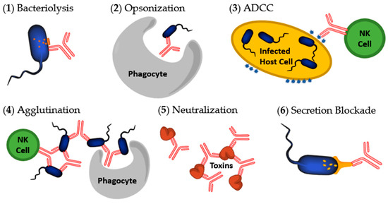 There are multiple mechanisms by which an antibody can act to destroy or inactivate infectious agents. These include: (1) Complement-dependent bacteriolysis; (2) Opsonization or phagocytosis; (3) Antibody-dependent cell-mediated cytotoxicity (ADCC); (4) Agglutination; (5) Neutralization; and (6) Secretion blockade (Figure 3) [25,33,34]. Mechanisms 1–3 and 5 were the original biological effects that Abs were thought to perform. Agglutination (4) is not typically considered one of the mechanisms of Abs against bacterial pathogens because it leads to mechanism 2 or 3 but is included here for clarity. Secretion blockades (6) were only recently discovered in the context of T3SS inhibition research.