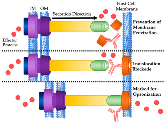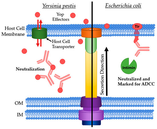 The critical function of the T3SS is to secrete proteins directly into host cells. These effector proteins have a wide variety of mechanisms and purposes [6,7,8,9]. Knockout or mutations of some effectors can result in attenuation of virulence and reduced pathogenesis, making them attractive targets [123]. The majority of effector proteins are translocated into the host cell and are unable to leave. This creates a challenge in using antibodies against these particular effectors [56]. Some effectors, however, can transverse and exit the host cell after translocation, making them available for neutralization by antibodies. Other effectors may be presented on the surface of host cells. These proteins are more accessible for targeting by antibodies.