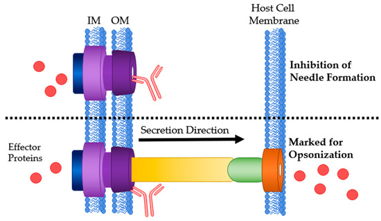 Effector proteins that are only present within the host cell become available upon cell lysis [25]. Abs targeting these effectors will not be able to prevent T3SS formation or secretion but will add to the host immune response [132,133]. Some infected host cells will also participate in antigen presentation. This is the process of breaking up non-native proteins, such as T3SS effectors, and displaying the fragments on the host membrane surface so that Abs can access them [25]. Although not as immunoprotective as T3SS inhibitory Abs, adjuvating Abs can be important to increase natural host immune response. Their use is common in combination with inhibitory Abs or as diagnostics.