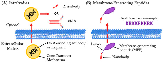 Innovative methods for intracellular delivery of Abs. (A) Intrabodies enter the host cell containing DNA encoding a therapeutic Ab or antibody fragment, most often a sdAb or nanobody; (B) Membrane-penetrating peptides are linked to Abs or fragments, commonly nanobodies, and allows for transversing membranes.