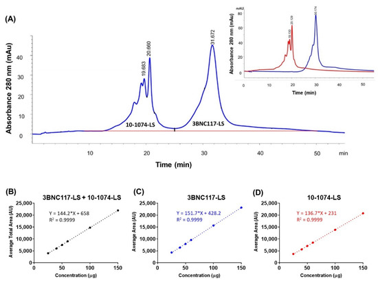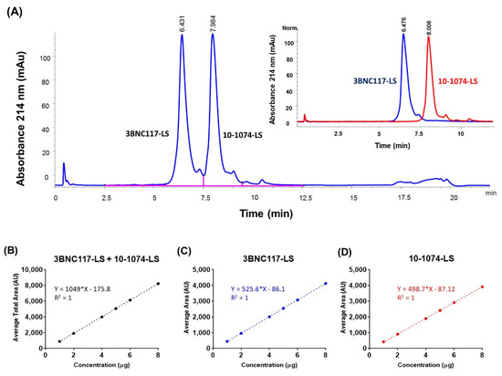 Reverse phase chromatogram with UV absorbance at 214 nm showing separation of two antibodies in the 1:1 co-formulated sample (total 150 mg/mL). (A) Peaks separated by reversed phase HPLC corresponding to the two antibodies are labeled. Inset shows the overlapped reverse phase chromatograms from the two-separate RP-HPLC run corresponding to the two antibodies, each at 150 mg/mL. The chromatography conditions were the same for the co-formulated and the individual antibody samples. Linearity analysis of concentration (in μg; x-axis) dependent increase in area under the curve (in Absorbance Units, AU; y-axis) for (B) total area (3BNC117-LS + 10-1074-LS), (C) 3BNC117-LS specific area, and (D) 10-1074-LS specific area.
