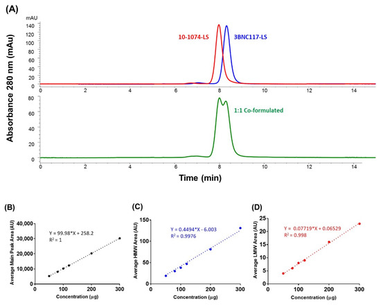 (A) Size exclusion chromatography profiles of 150 mg/mL for 10-1074-LS and 3BNC117-LS antibodies, individually formulated (top) and after co-formulation (1:1, 75 mg/mL each) (bottom) on the TSKgel column. Linearity analysis of concentration (in μg; x-axis) dependent increase in area under the curve (in Absorbance Units, AU; y-axis) for (B) average main peak (monomer) area (3BNC117-LS + 10-1074-LS monomer), (C) average High-Molecular Weight (HMW) peak area, and (D) average Low Molecular Weight peak area.
