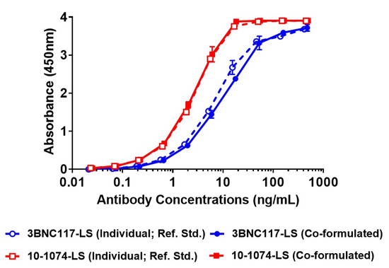 A sandwich ELISA was performed using 96-well Maxisorp plates coated over-night at 2–8 °C with 1 μg/mL of an anti-idiotypic antibody that specifically recognizes 3BNC117-LS (anti-ID monoclonal antibody) or 1 μg/mL of an anti-idiotypic antibody that specifically recognizes 10-1074-LS (anti-ID monoclonal antibody). After washing, plates were blocked with 200 μL Protein free blocking solution at 25 °C for 2 h at 200 RPM. Co-formulated antibody samples, quality controls and reference standards were added and incubated at room temperature. Subsequently, the plate was washed and 100 μL of 1:10,000 diluted peroxidase-conjugated AffiniPure F (ab’) 2 Fragment Goat anti-Human IgG Fcγ Fragment specific (Jackson Immuno Research, West Grove, PA, USA) was added. The plate was incubated at room temperature for 60 ± 10 min at 200 RPM. The plate was washed, and the wells were incubated with 100 μL of SureBlue TMB substrate (Fisher Scientific, Somerset, NJ, USA) to develop the chromogenic signal (10 min at room temperature at 200 RPM). The reaction was stopped with the addition of 100 μL of 1% hydrochloric acid. The absorbance was measured at 450 nm using the Molecular Devices plate reader fitted with Softmax Pro software (Molecular Devices LLC, Sunnyvale, CA, USA). Titration curves for the reference standard and each test sample were created using 4-parameter logistic curve fitting to calculate EC50 values using GraphPad Prism software (version 7).