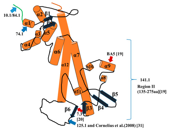 Schematic diagram of binding sites on the V-antigen. The structure of the V- antigen as shown is based on that reported by Derewenda et al. (2004) [30]. The orange tubular structures represent coiled-coil peptides, and the dark blue structures represent β-sheets with arrow heads pointing in the 5′ to 3′-direction. The red arrows are pointing to reported or putative binding sites for mAb 7.3 [21] and BA5 [20]. The light blue arrows are pointing to the binding sites of mAbs (10.1/84.1, 74.1, and 125.1) from this report, except the binding site for 125.1 also represents that reported by Cornelius et al. (2008) [31] for polyclonal antibodies induced by a nonhuman primate and BALB/c mice by the wild-type V-antigen [31]. The amino-terminal end of the protein is colored green, while the C-terminal end is colored red. The conformational binding site of 141.1 is unknown but present on the 135–275 amino acid protein fragment or in designated region II of the V- antigen [19].