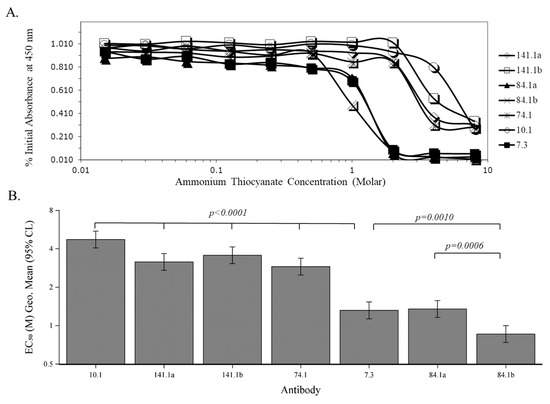 Evaluation of the avidity of anti-V mAbs to the V-antigen. (A). The avidity of anti-V mAbs to the V-antigen was measured in increasing concentrations of ammonium thiocyanate concentrations. After the binding of the anti-V mAbs to the V-antigen the mAb-V-antigen complex was incubated in increasing concentrations of ammonium thiocyanate (0.015 M to 8 M) for 30 min at 37 °C. Anti-V mAbs 7.3, 10.1, 74.1, 84.1 and 141.1 were examined under these conditions. In some cases, unbiotinylated (designated with an “a” suffix) and biotinylated (designated with a “b” suffix) mAbs were examined. This assay was performed 3 times in triplicate, and one of the examples is shown here. (B). The EC50 of the avidity assay comparing the anti-V-antigen mAbs is shown. The differences between the EC50 of mAb 7.3 to the other mAbs was compared, and the difference was p < 0.0001 with mAb 10.1, 141.1a, 141.1b, and 74.1. When the EC50 of 7.3 was compared with that of 84.1a and 84.1b, there was only a difference with 84.1b (p = 0.0010) but not with 84.1a.