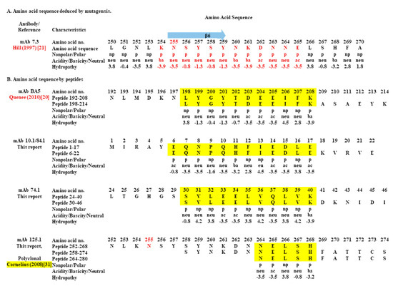 Summary of amino acids in putative binding sites in the V-antigen derived from mutagenesis or mAbs binding to linear peptides. (A). Region of binding of mAb 7.3 derived from mutational analysis identified N255 as a critical amino acid [21]. The region from amino acid 250 to 270 is shown with N255 in red and the beta-sheet β6 shown above. Also listed in red are amino acids 254–265 that includes N255, and polarity (nonpolar, np/polar, p), acidity (ac)/basicity (ba)/neutrality (neu), and hydropathy index. Note 12 contiguous negative hydropathic amino acids. (B). Region of common overlapping V-antigen peptides identified by binding by mAbs (in yellow). Listed are mAbs BA5 [20] (11 amino acids), 10.1/84.1 (12 amino acids), 74.1 (11 amino acids), and 125.1 (5 amino acids). Also listed are the amino acid number, amino acid, polarity (nonpolar, np/polar, p), acidity(ac)/basicity (ba)/neutrality (neu), and hydropathy idex. The amino acids listed for mAb 125.1 were also identified by another study with polyclonal antibodies from nonhuman primates and BALB/c mice raised against V-antigen [31]. N255 within this region was highlighted in red. The peptide 264–280 amino acids that was recognized by 125.1 was shortened (275–280 amino acids) for presentational purposes in the figure.