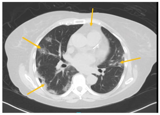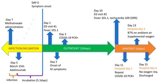 The patient is a 60-year-old female nurse with a past medical history of autoimmune disease, including rheumatoid arthritis (RA), systemic lupus erythematosus (SLE), and ileocolonic inflammatory Crohn’s disease in endoscopic remission. Both the joint and bowel complaints were controlled for many years on weekly adalimumab 40 mg and methotrexate 12.5 mg. She presented to the emergency department (ED) for the evaluation of one day of persistent fevers and generalized myalgias on March 20th, 2020. Her last dose of adalimumab was administered 5 days prior, while her last dose of methotrexate was administered 7 days prior.