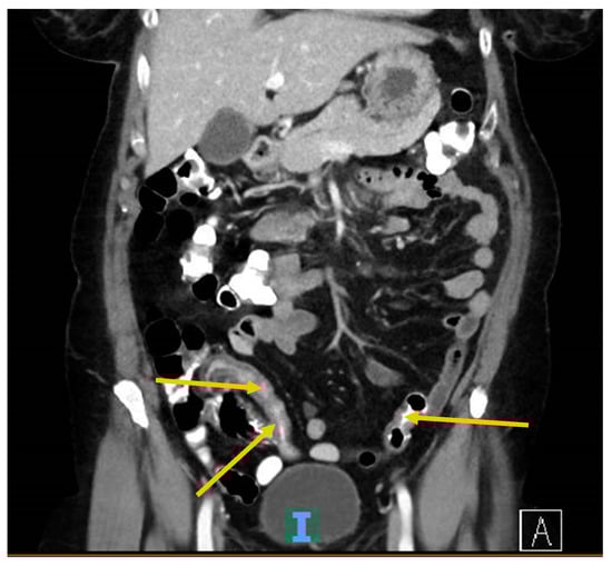 The next day, on 21 March 2020, she noted the onset of gastrointestinal symptoms, including non-bloody, watery diarrhea (5–6 episodes per day, including nocturnal symptoms), nausea with non-bloody, non-bilious emesis, and intermittent para-umbilical abdominal cramping (5/10 in intensity, no radiation, associated with bowel movements and vomiting episodes). She had not experienced a Crohn’s-related flare in over a decade and the symptoms were not consistent with her usual flares. Her fevers persisted and worsened, with a reported T max of 102°F. Three days after the initial ED evaluation, her COVID-19 test returned positive.