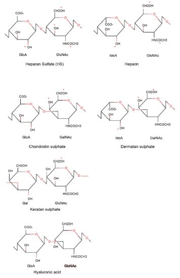 Structure of glycosaminoglycan chains. The repeating disaccharides in different types of glycosaminoglycan chains are presented. The different sulphation positions in each glycosaminoglycan (GAG) are marked by * in red.