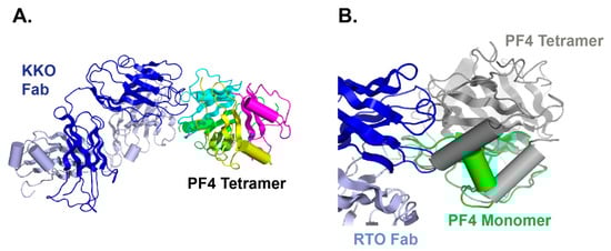 RTO binding to PF4 monomer impedes PF4 from forming tetramers, thus prevent PF4 tetramer-based immune complex formation, which underlies the pathogenesis of HIT. (A) HIT-like antibody KKO (blue) binds to PF4 tetramers (green, yellow, cyan and magenta; (B) blocking antibody RTO (blue) binds to PF4 monomer (green) and prevents tetramer (gray) formation.