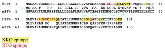 Comparison of human PF4 (hPF4) and mouse PF4 (mPF4) sequences, showing the overlap of KKO and RTO epitopes. Since KKO preferentially binds to PF4 tetramer, its epitopes are contributed by amino acid residues from different chains within a PF4 tetramer. Dash lines depict the internal disulfide bonds.